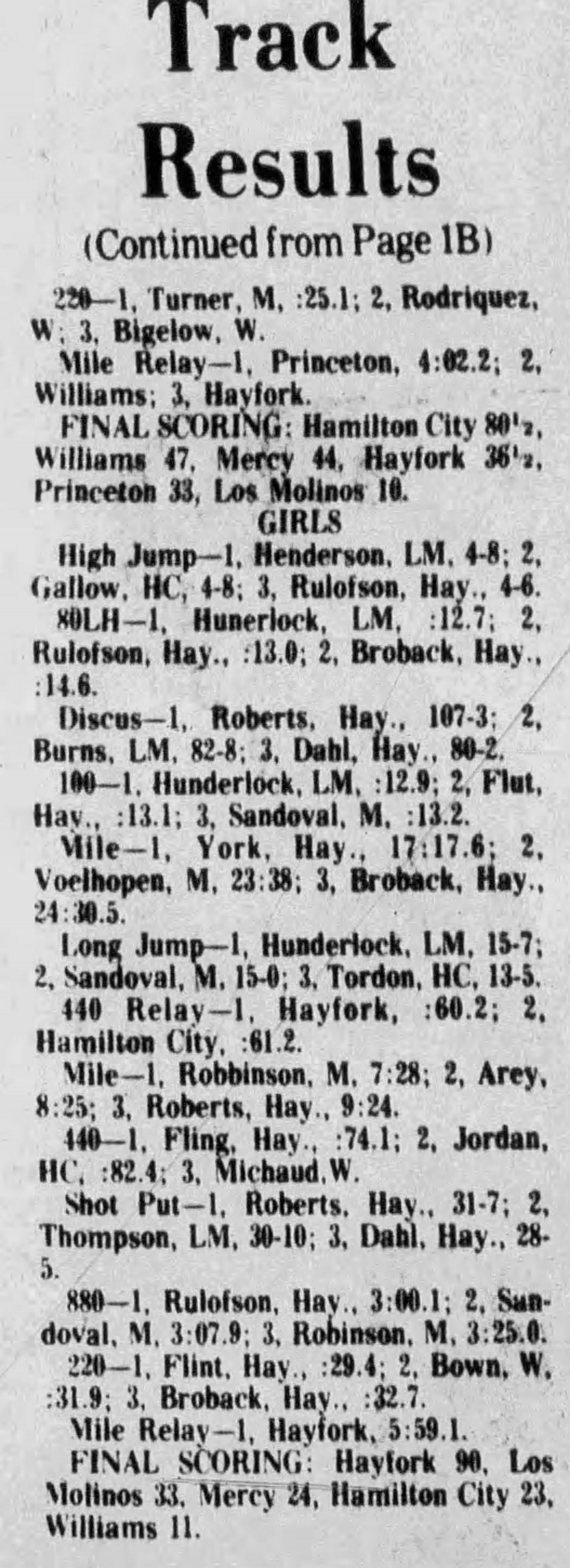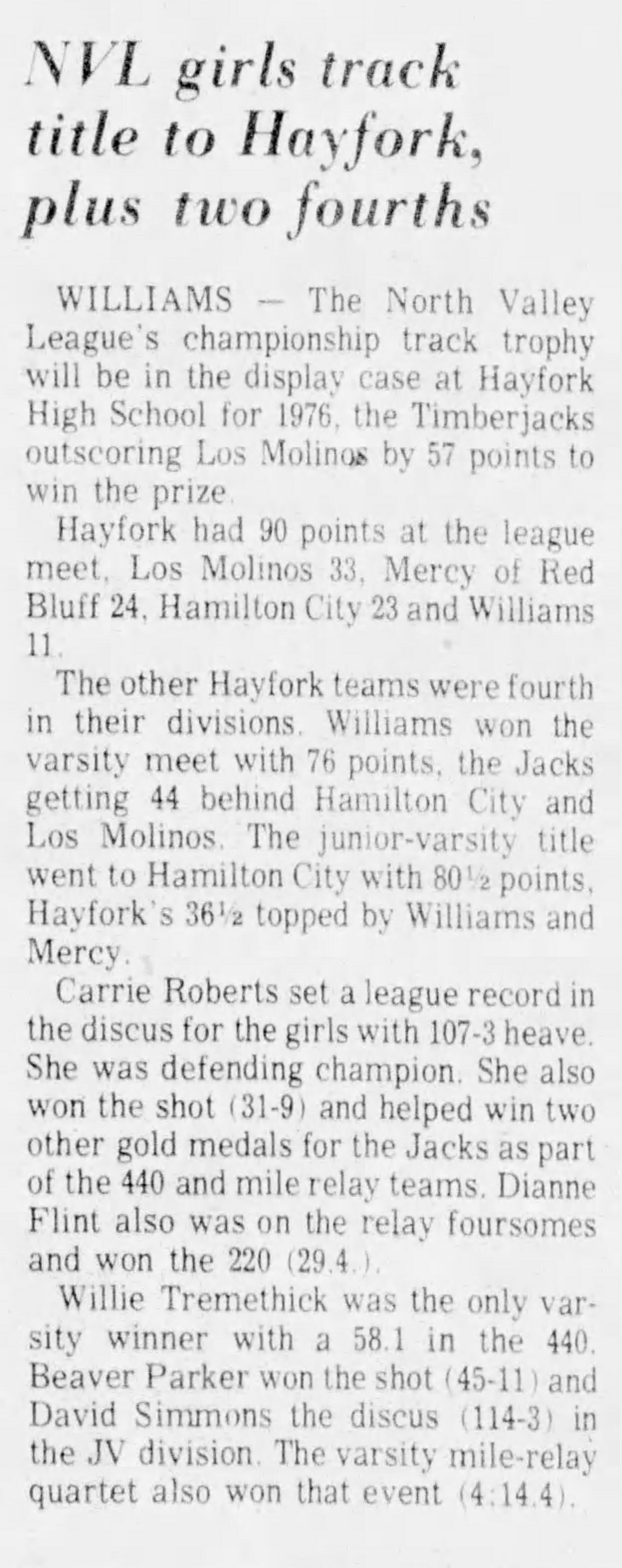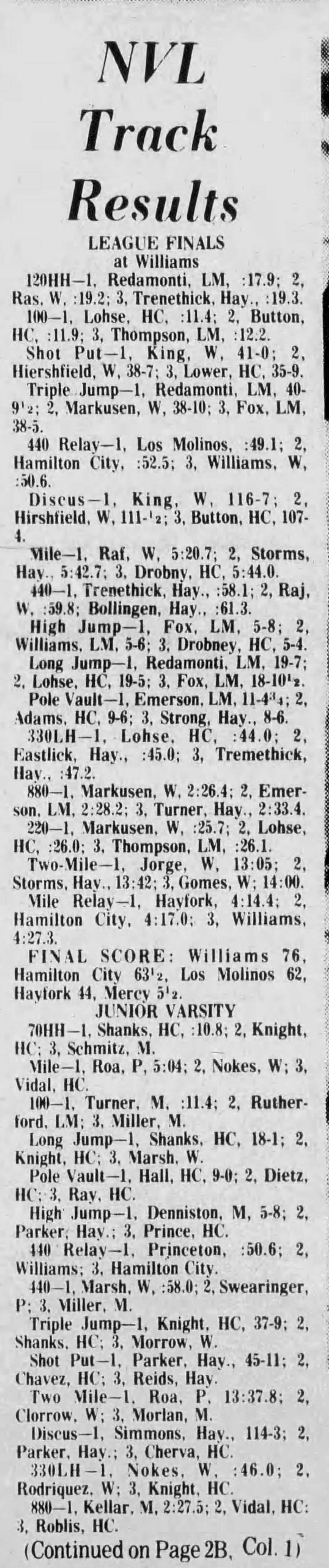 1976 Northern Valley League (NVL) Track & Field Championships Williams High School Williams, California Saturday May 15, 1976