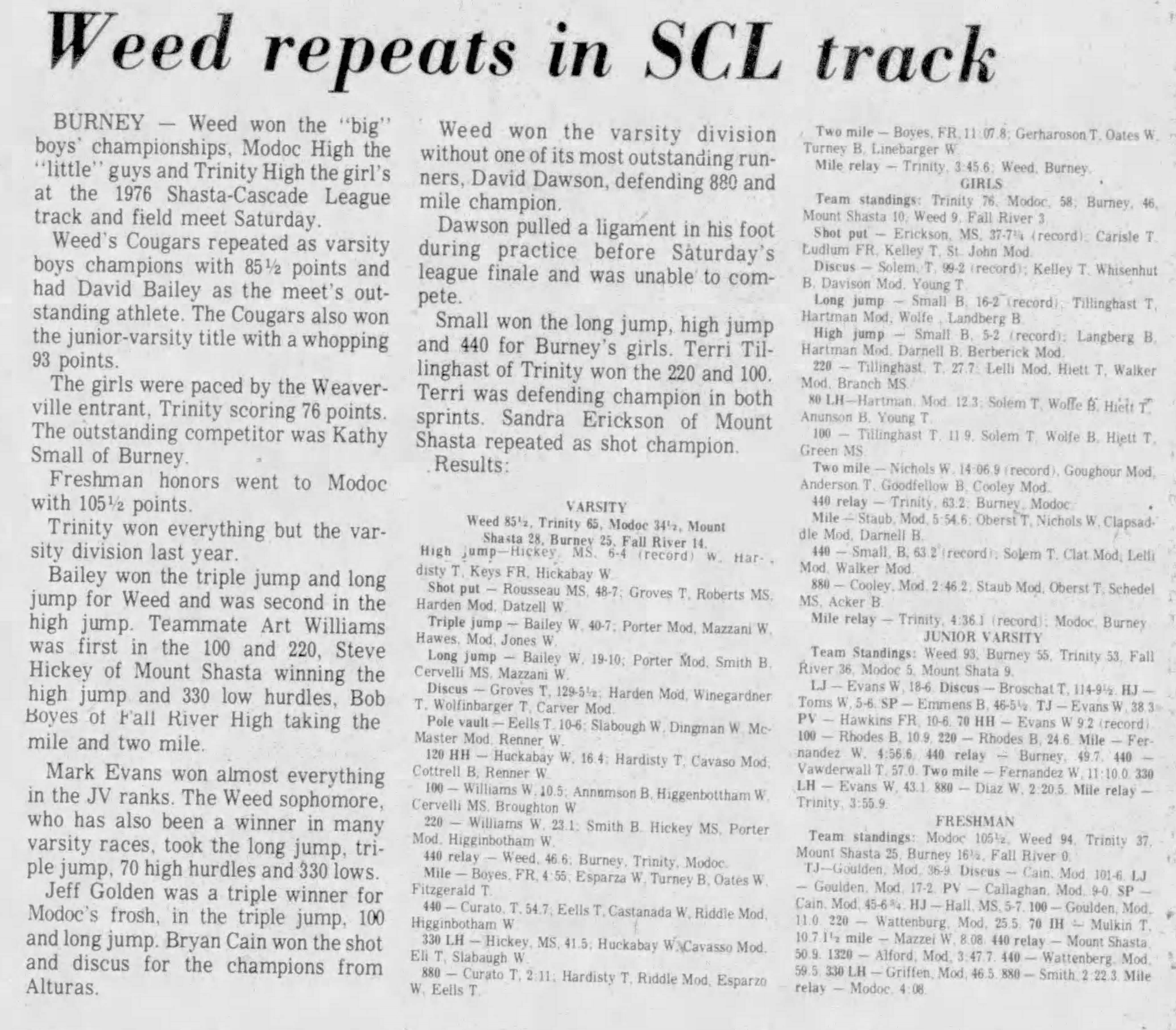 1976 Shasta Cascade League (SCL) Track & Field Championships Burney High School Burney, California Saturday May 15, 1976