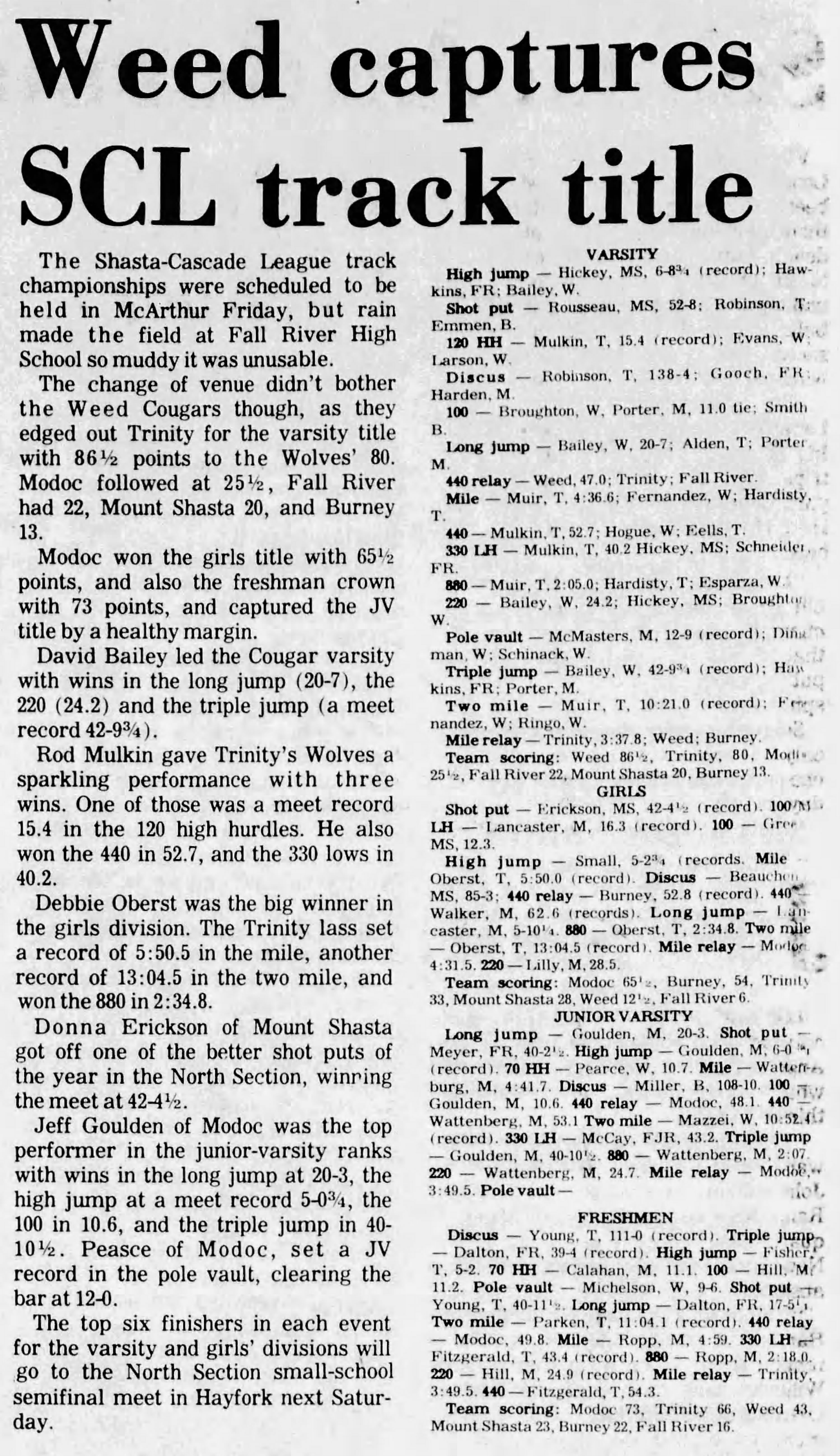 1977 Shasta Cascade League (SCL) Track & Field Championships not Fall River High School not McArthur, California Friday May 13, 1977