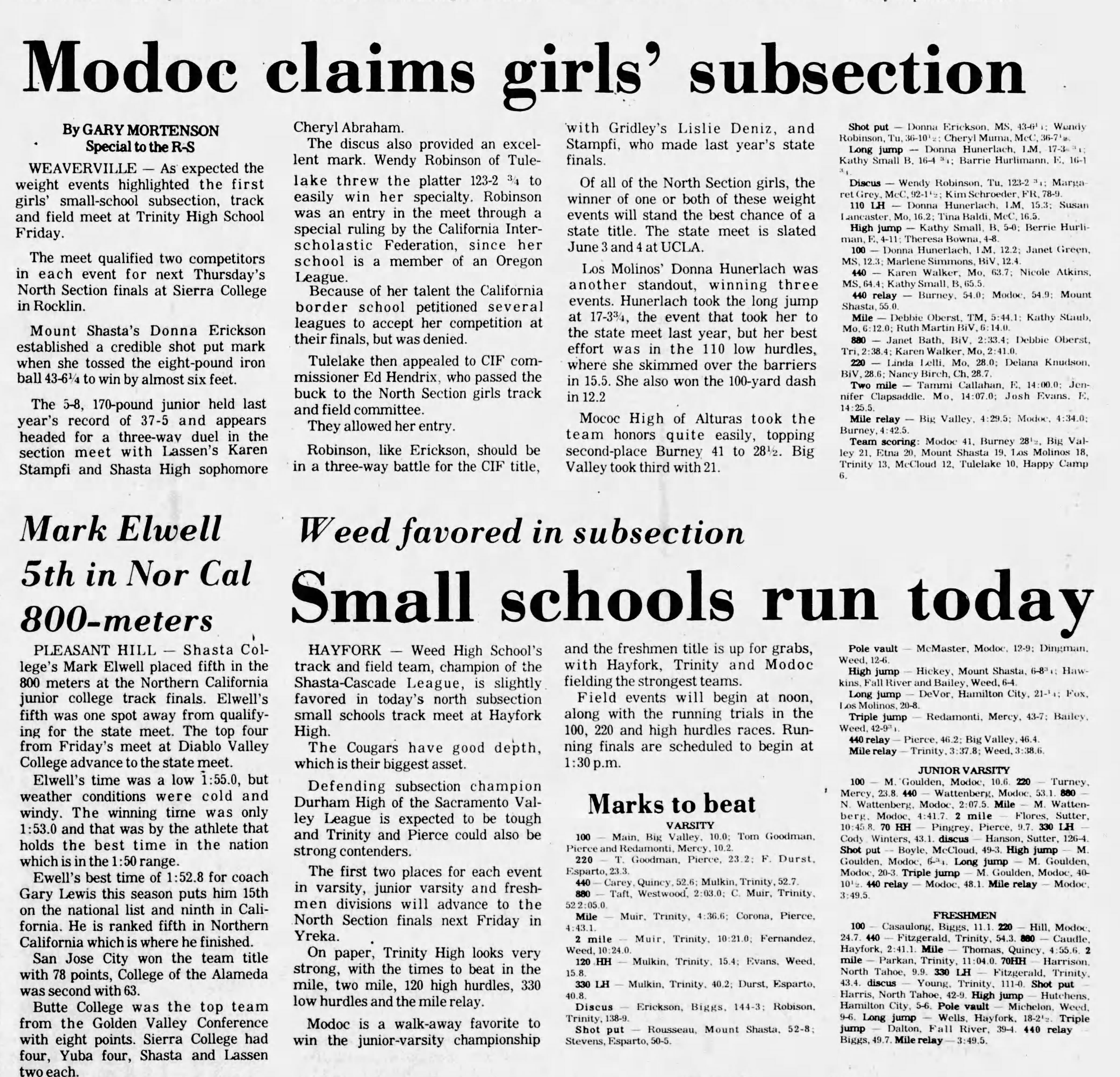 1977 Small Schools Subsection Qualifying Meet - Boys Hayfork High School Hayfork, California Saturday May 21, 1977 1977 Small Schools Subsection Qualifying Meet - Girls Trinity High School Weaverville, California Friday May 20, 1977