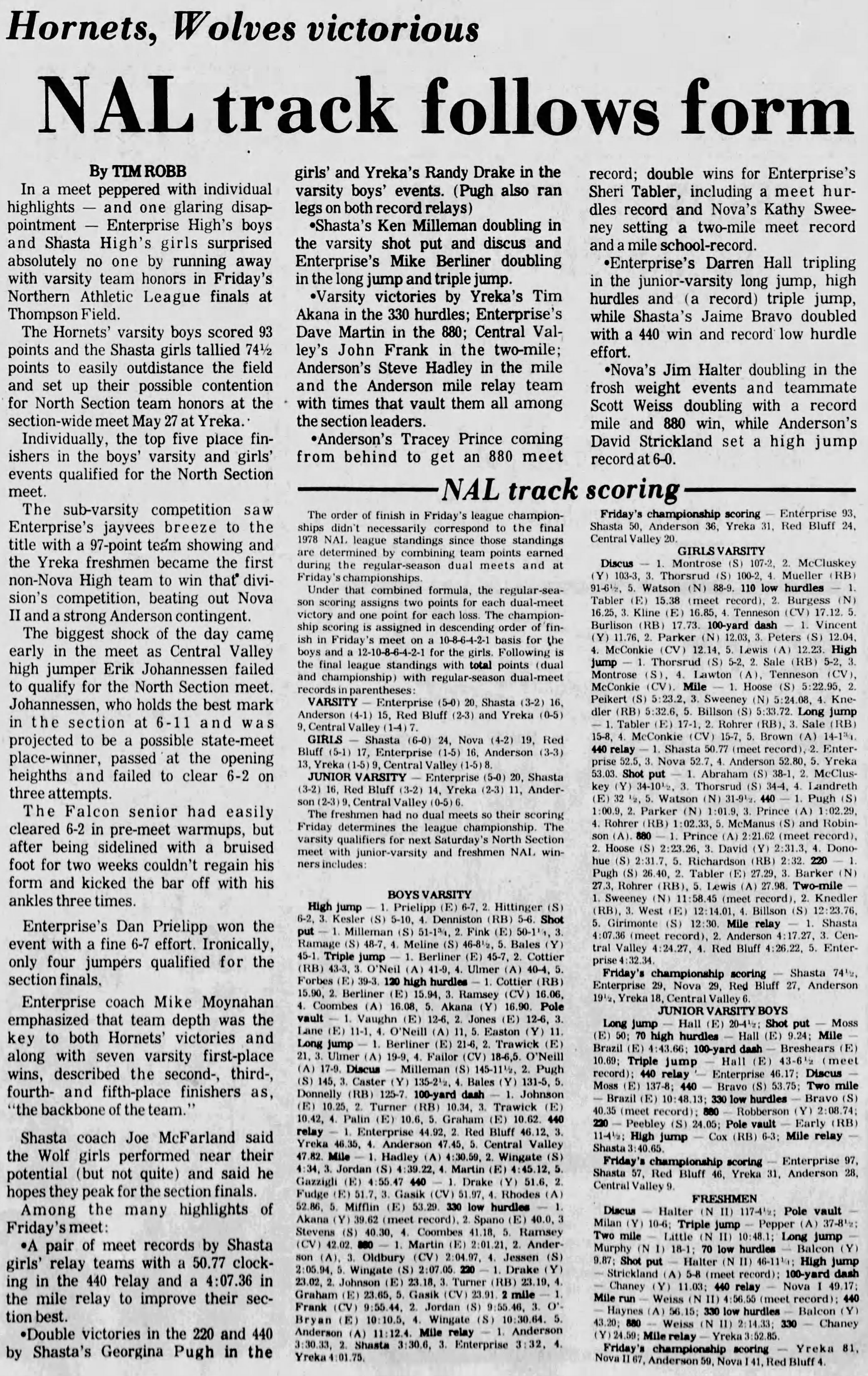 1978 Northern Athletic League (NAL) Track & Field Championships Thompson Field Shasta High School Redding, California Friday May 19, 1978
