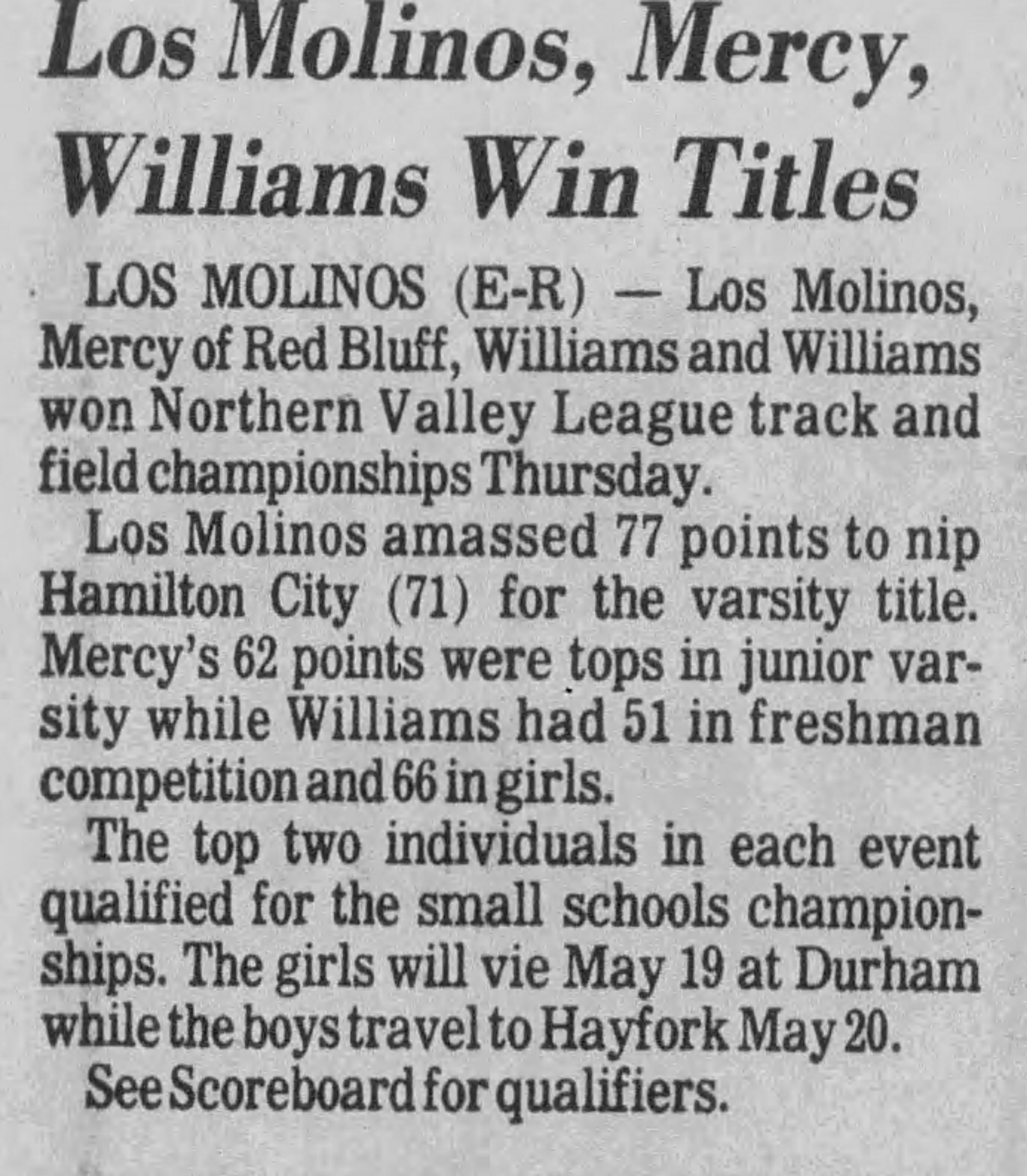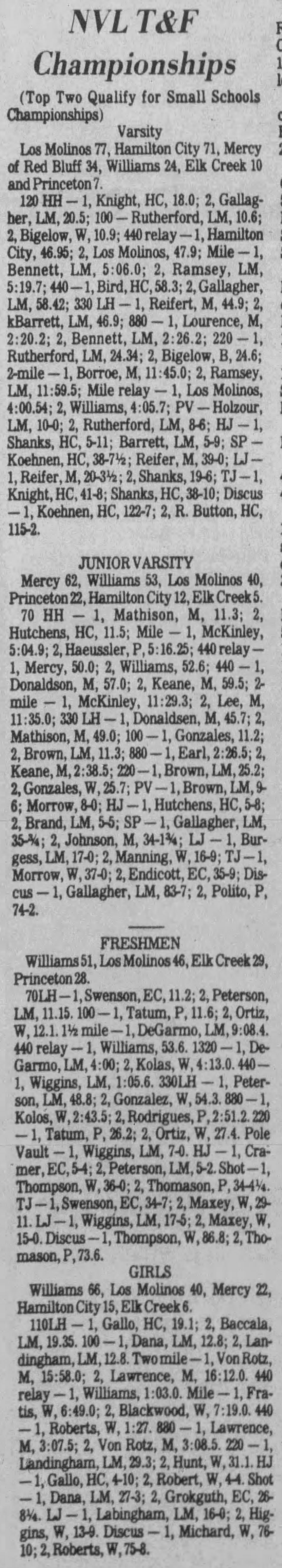 1978 Northern Valley League (NVL) Track & Field Championships Los Molinos High School Los Molinos, California Thursday May 11, 1978