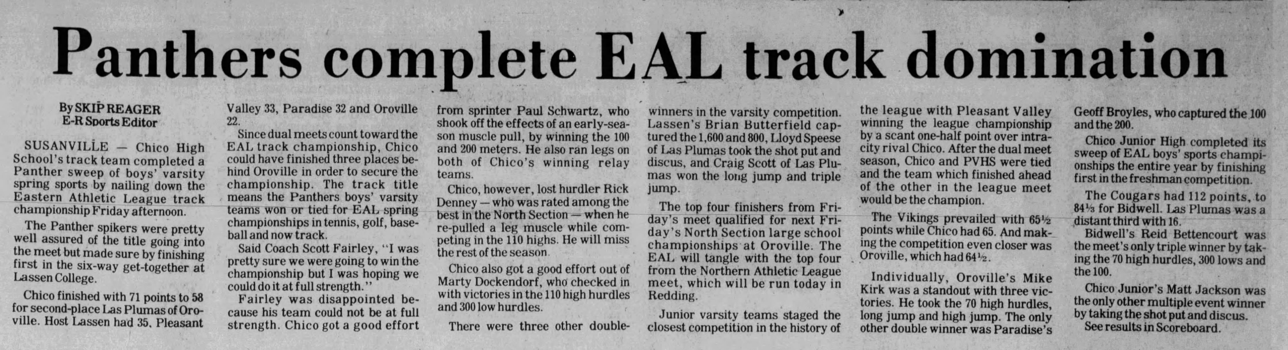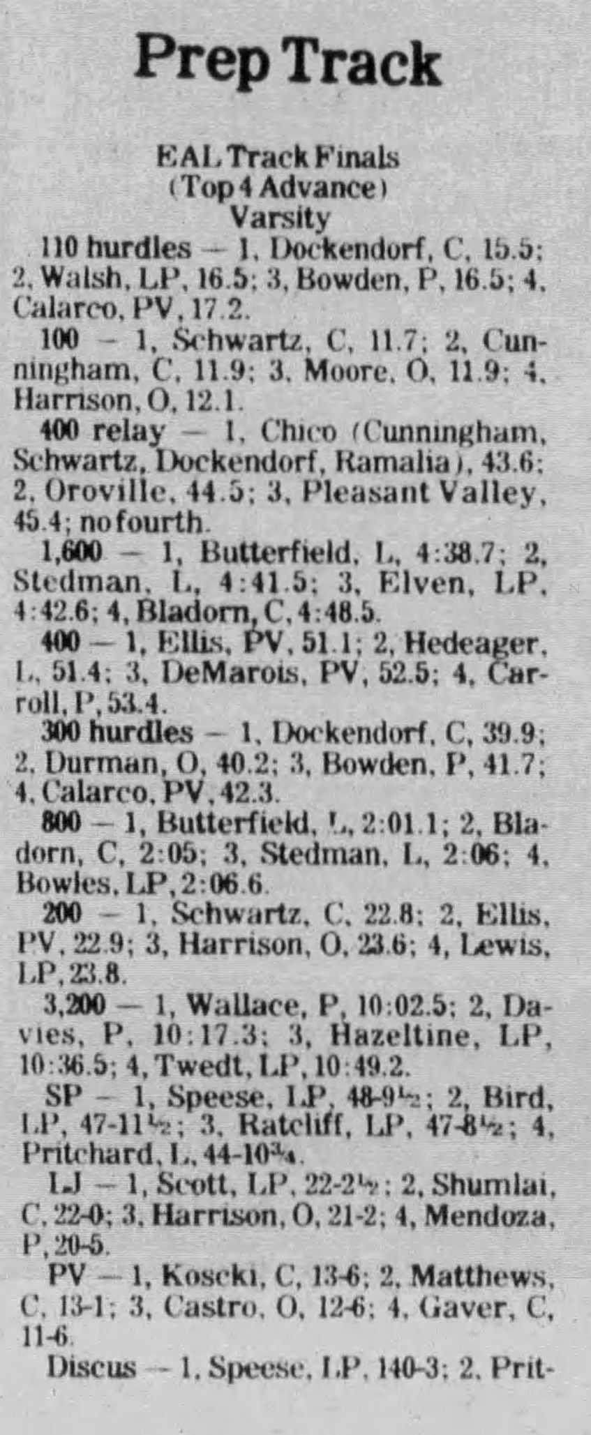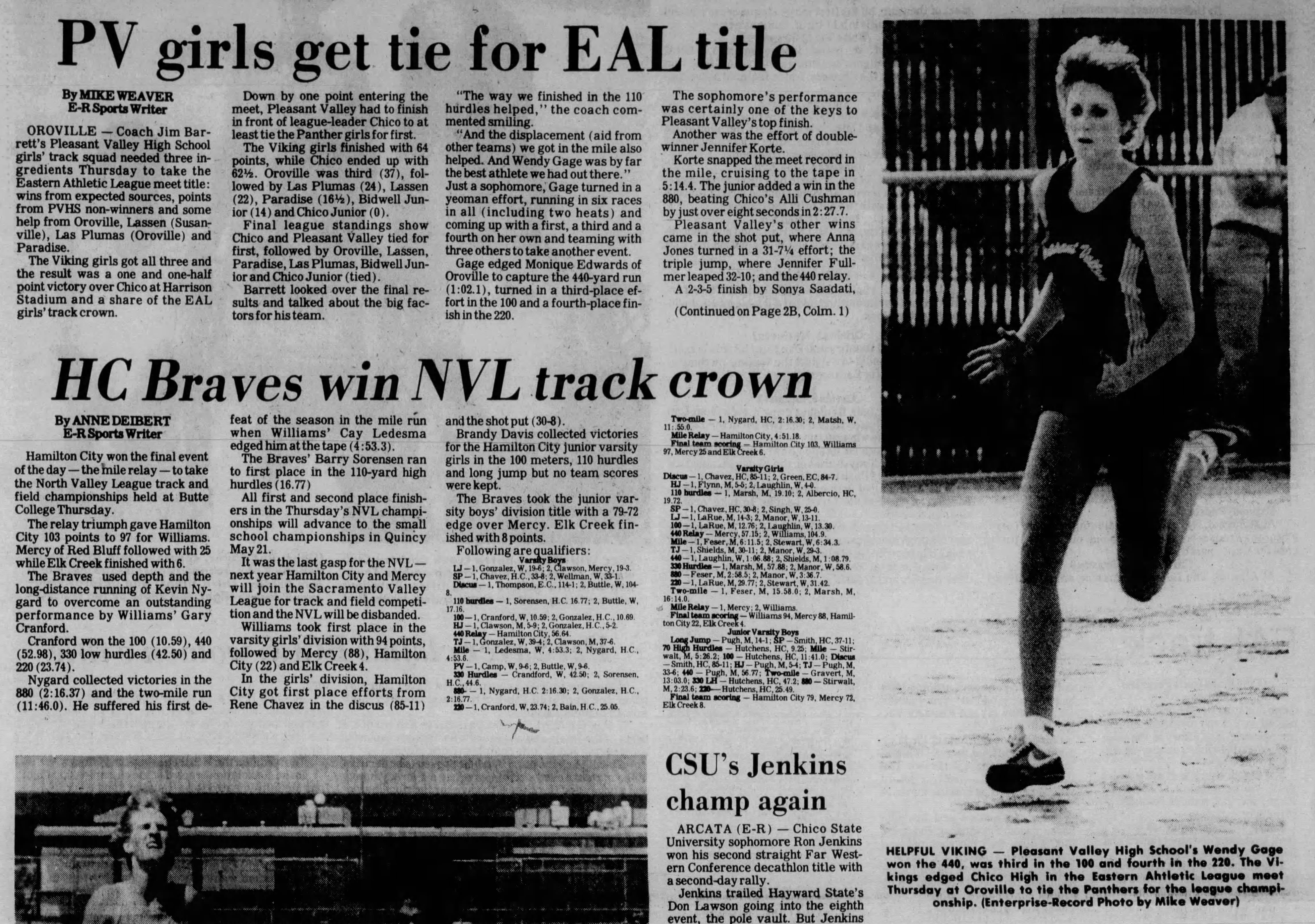 1982 EAL Girls Track & Field Championships Harrision Stadium Oroville, California Thursday May 13, 1982 1982 EAL Boys Track & Field Championships Harrision Stadium Oroville, California Friday May 14, 1982