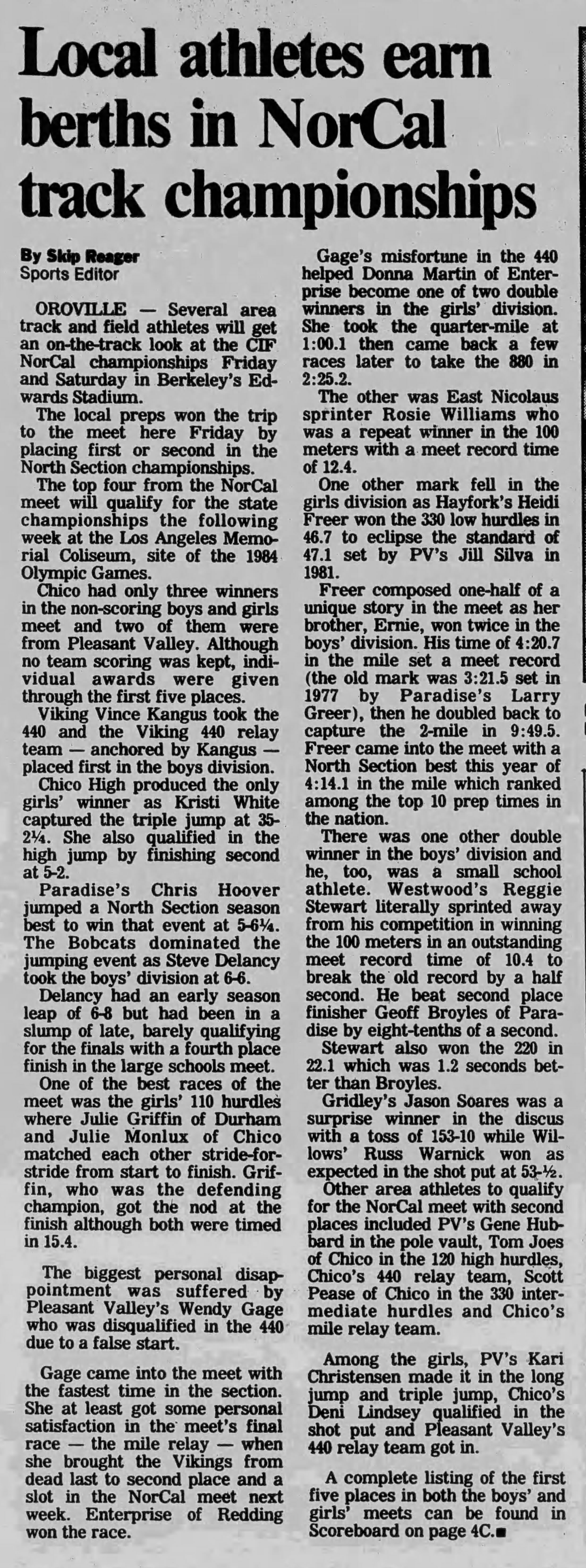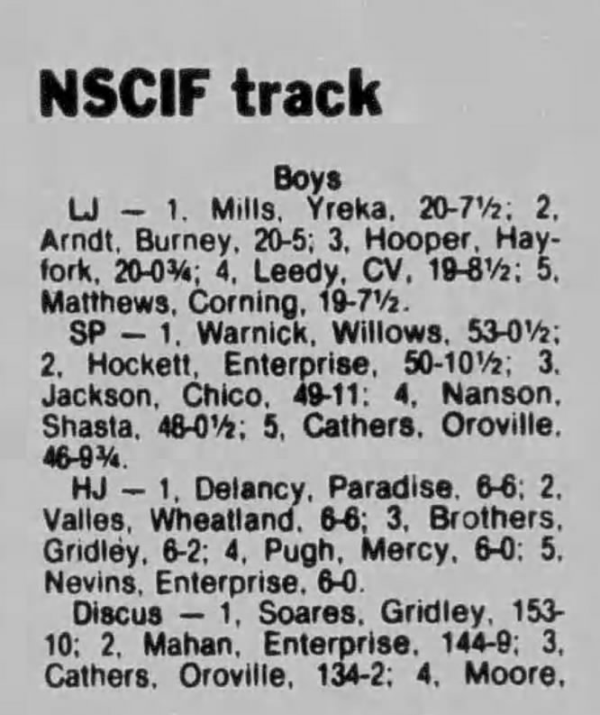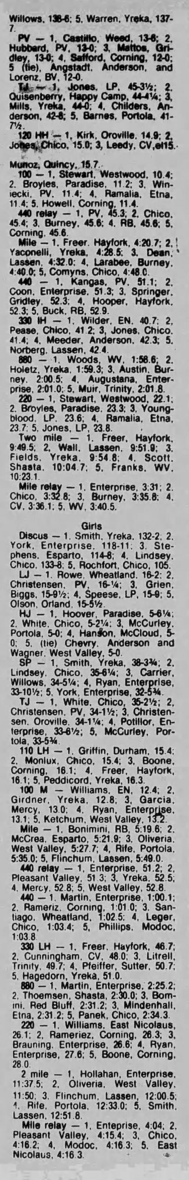 1984 NSCIF Track & Field Championships Harrision Stadium Oroville, California Friday May 18, 1984 Transcribed results