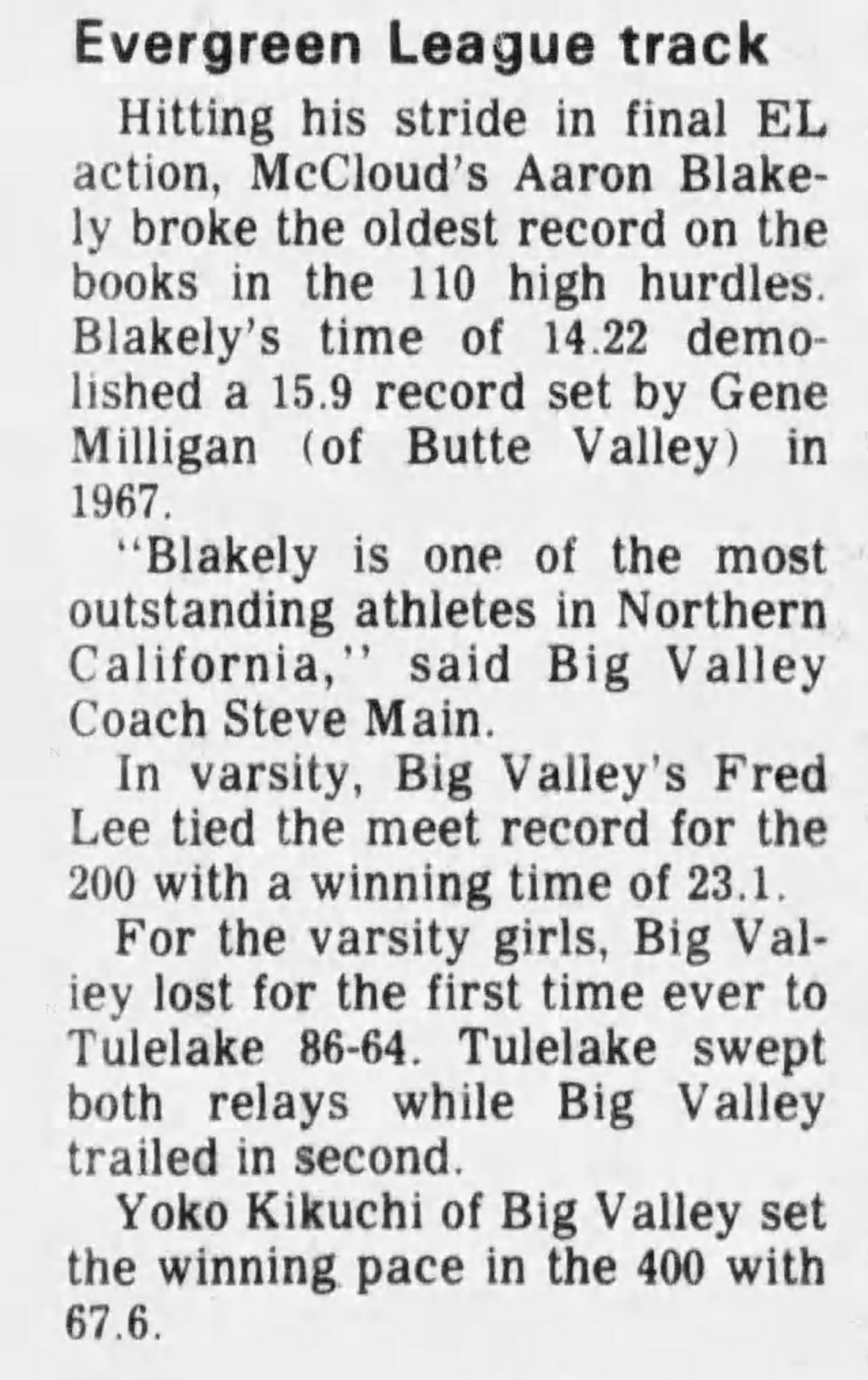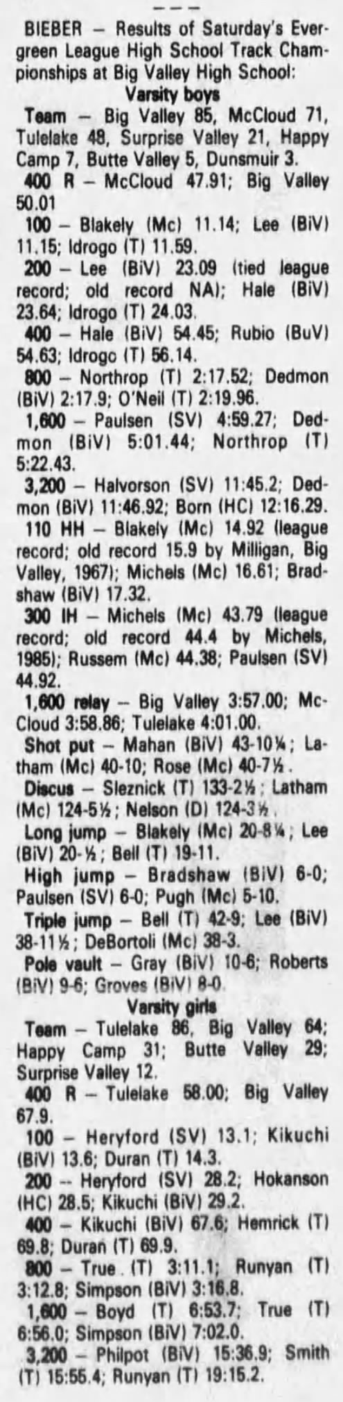 1986 Evergreen League (EL) Track & Field Championships Big Valley High School Bieber, California Saturday May 17, 1986