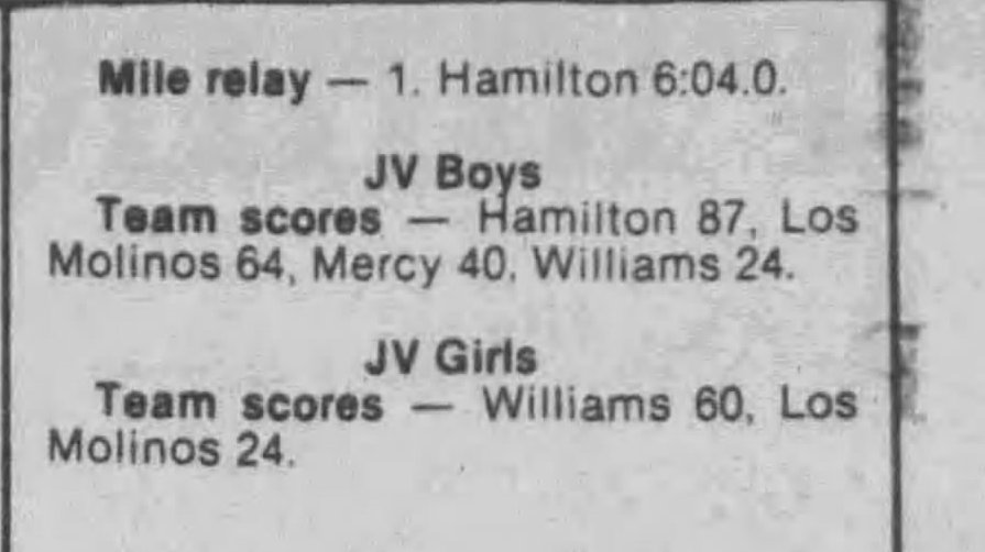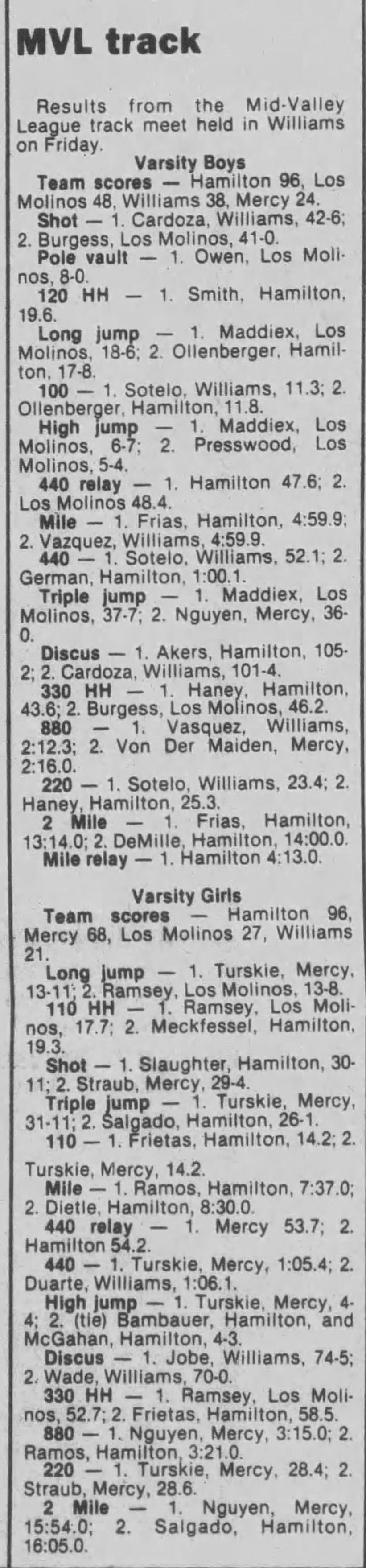 1989 Mid Valley League (WVL) Track & Field Championships Williams HS Williams, California Friday May 12, 1989