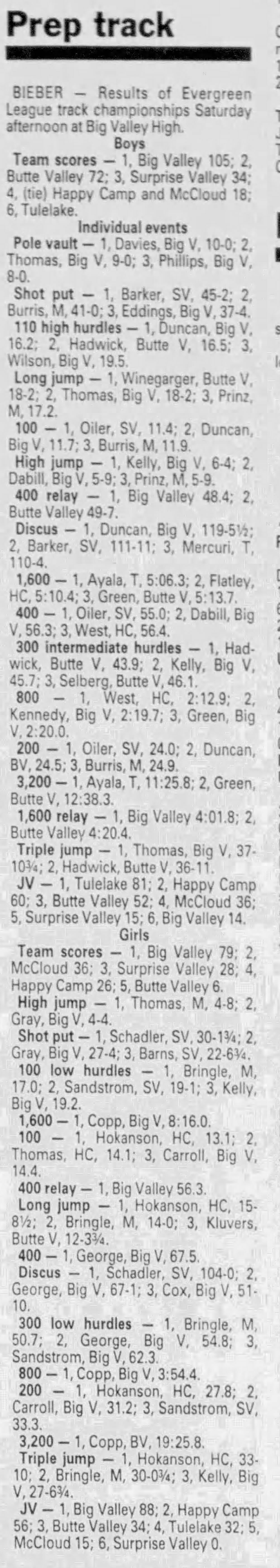 1991 Evergreen League (EL) Track & Field Championships Big Valley HS Bieber, California Friday May 10, 1991