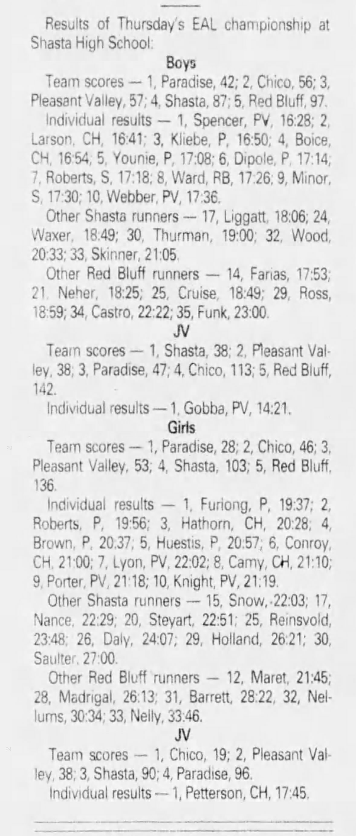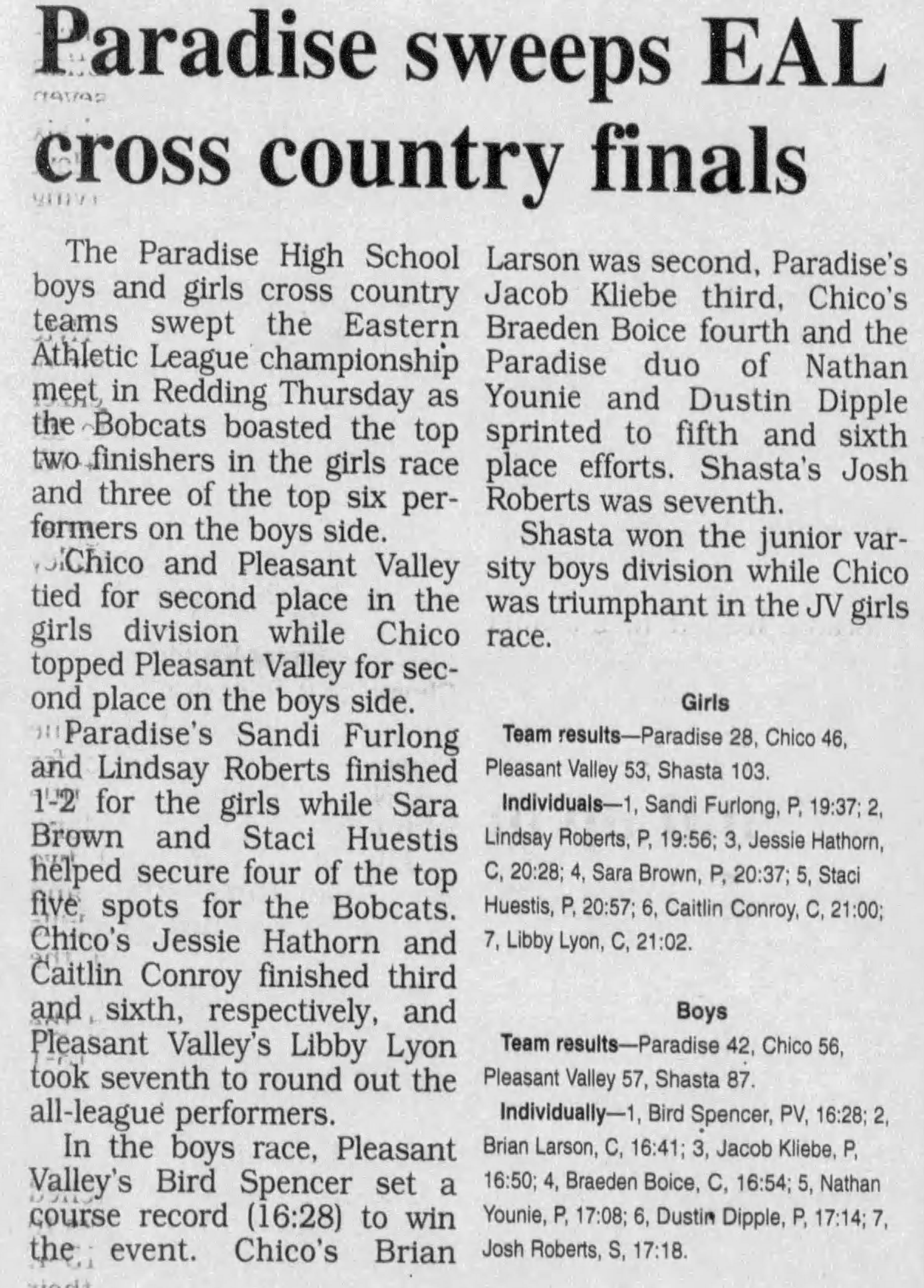 1999 EAL Cross Country Championships Shasta HS (arboretum course) Redding, California Thursday November 4, 1999 Partial results