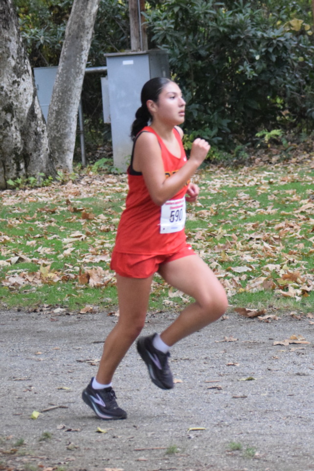 Next up were the varsity girls. Chico's Taylor Wellersdick got out quick with PV freshman Julie Plummer right on her heals as the two gained an early advantage over a large chase pack as they traversed down the levee for the first time. Plummer was still shadowing Wellersdick as the duo came by the mile mark around 5:40, not as quick as two and a half weeks ago at the Chico Autumn Invitational but still well ahead of a disintegrating chase pack. The Chico tandem of Molly Shewey and Harper Ducale passed the mile mark next with a 20 meter lead over the PV's Avery Hankins and Emily Arnold who were tucked in behind Foothill freshman Ryah Kellogg. After rounding the two of the Hooker Oak ballfields, runners used a paved path to reverse course and head back past the mile mark and up a short rise and their way back to the levee. At this approximate the halfway point, Wellersdick still had the lead but looking a bit more stressed than her shadowing rival Plummer. Shewey and Ducale came by next a sizeable distance ahead of Kellogg who was all by herself in fifth. Hankins and Arnold were being closely tracked by Chico's Moreno-Delgado and her teammate Neva Bilinski with a couple of Foothill runners (Belong, Wilson) not too far back as the race headed away from most of the spectators.