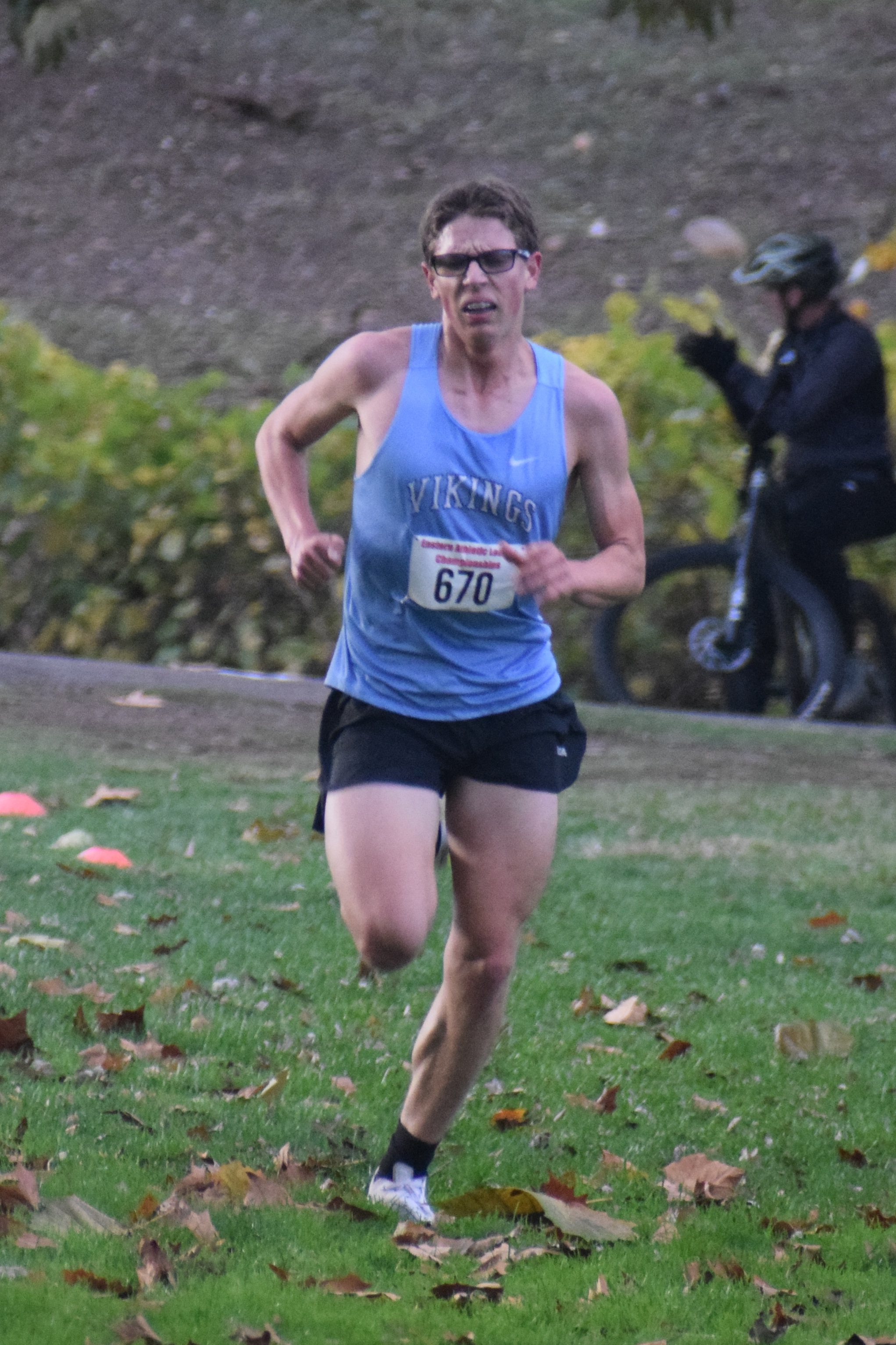 After disappearing for a time, spectators found that this lead pack had completely fallen apart as big brother Justin Plummer's surge into the lead had the others struggling to stay in contact. Viking teammate Lugo and Lara, along with Shasta's Liberato, likely knowing the individual win was out of the question, turned their attention to the battle was for second. Girt was not looking good probably thinking his Panther's chances for the league title were on the wane as he and his young teammate Dana had lost contact with the Viking runners ahead. Behind them Chico's Kressin was battling Foothill's Bedolla with Shasta's Micah Good still hanging around and in the hunt.