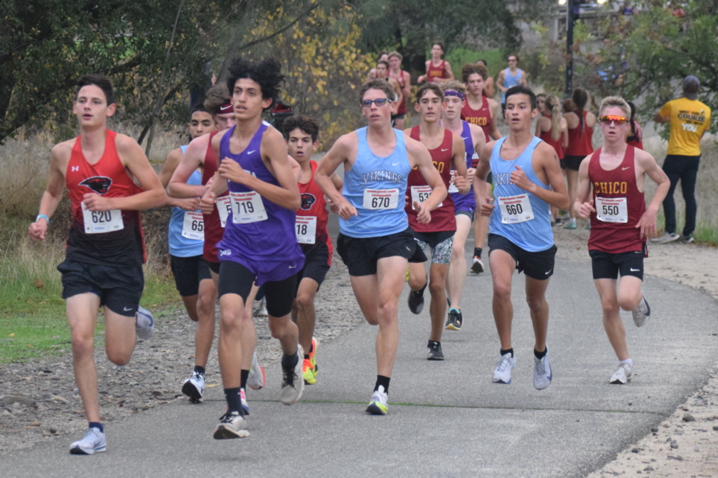 The varsity boys race closed out the competition. A large lead pack worked its way down the levee on the way to circumnavigating the horse riding area. Ten boys still comprised the lead pack at the mile, three from Chico, three from Pleasant Valley, two from Foothill and two from Shasta. The same ten, although strung out some, were still there as they passed the halfway point with Shasta's Liberato, Chico's Girt pressing the pace with Viking teammates Plummer, Lugo and Lara doing the best to stay close.