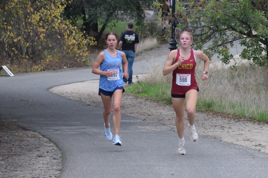 With anticipation running high in what seemed like an eternity, runners finally started trickling back along the elevated levee. Plummer comes into view first, Wellersdick is next and after a bit of a wait its Shewey and then Ducale. Positions remain unchanged as they come off the levee. Rounding the ballfields one last time, Plummer cruises home with a time (18:09) even better than she ran the last time she was on the course. Twenty five seconds later a deflated Wellersdick, looking disappointed she was unable to make it a closer race, still ran a time only four other girls have bettered (18:34). A minute later Chico teammates Shewey and Ducale with a modest gap in between, finish to give the Panthers a 2-3-4 finish and likely insuring the victory for Chico. A half minute later Foothill's Kellogg took fifth followed by her senior teammate Sienna Belong, who had passed two Chico and two PV runners in the latter half of the race to take sixth. Rounding out the top ten was PV's Hankins in seventh, Chico teammates Moreno-Delgado in eighth and Bilinski in ninth with the Viking's Arnold rounding out the top ten finishers. This made for a comfortable win by the Chico girls as they topped PV & Foothill 26-43-53 while Red Bluff, Enterprise and Shasta all failed to have complete teams.